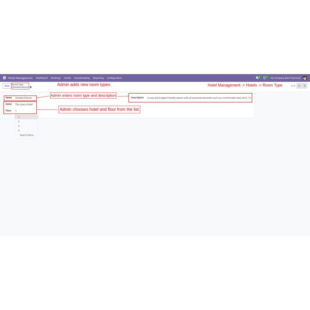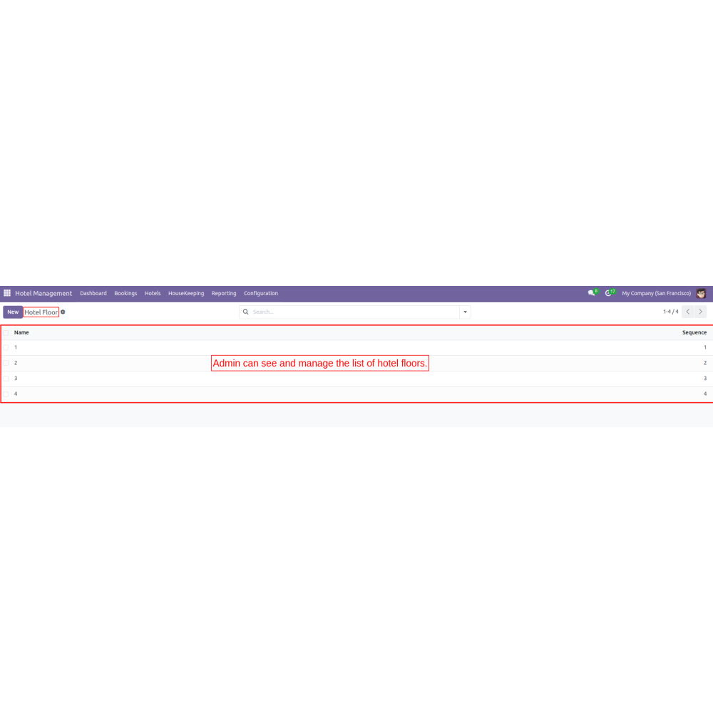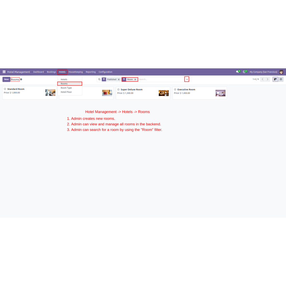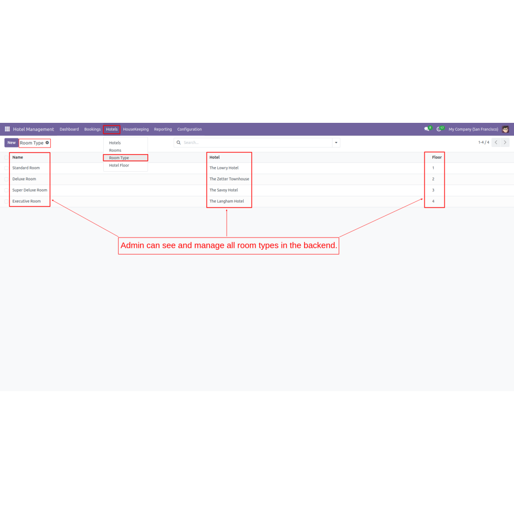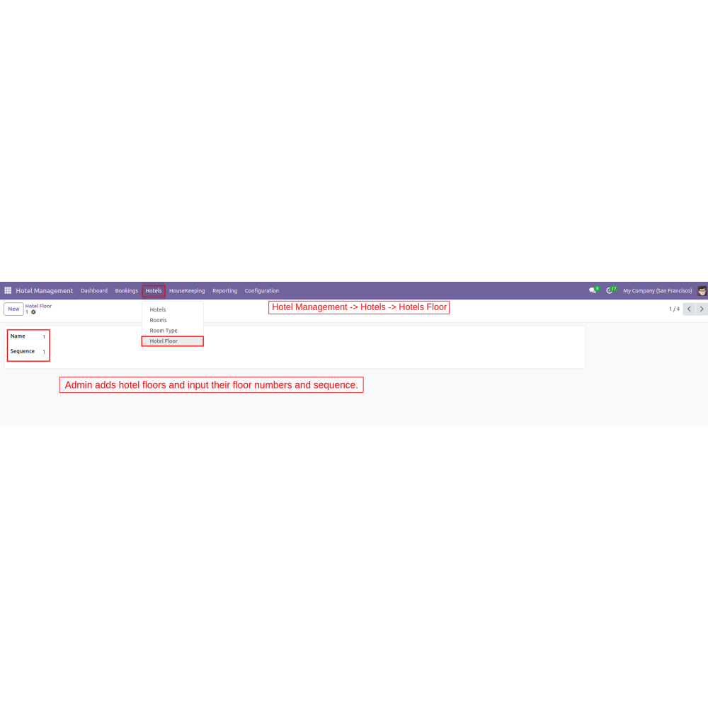 Navigate to Hotel Management -> Hotels -> Hotels, Rooms, Room Types, Hotel Floors.