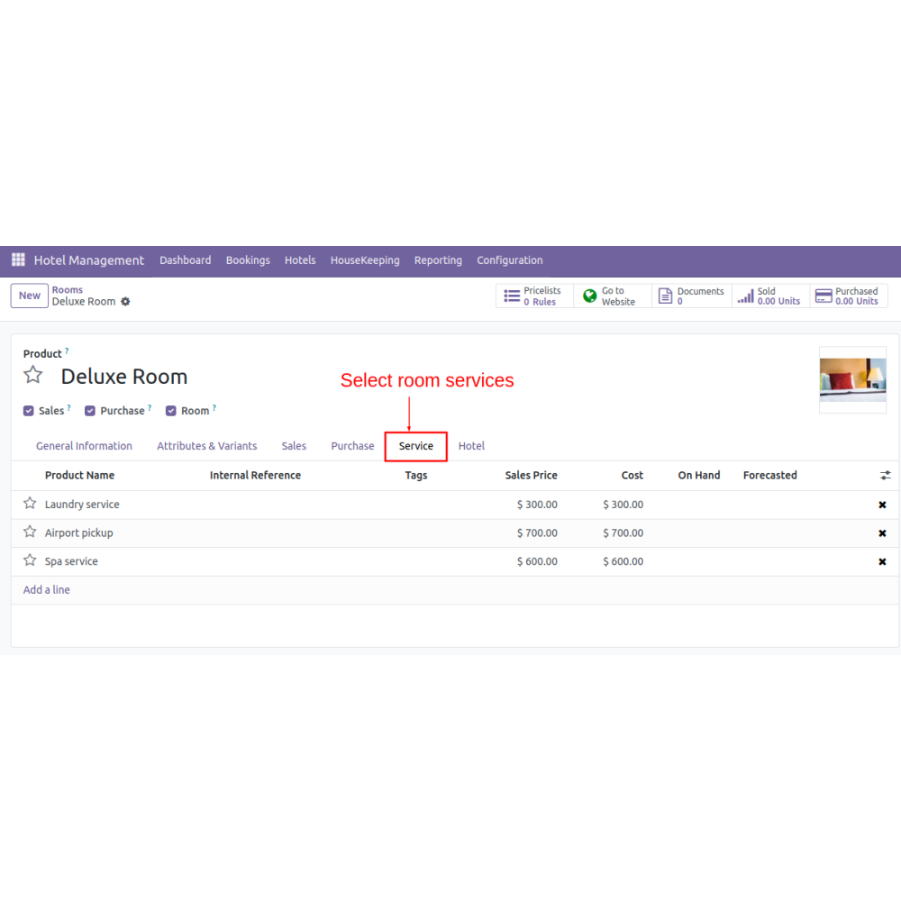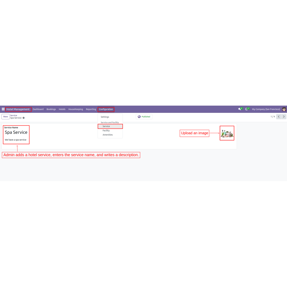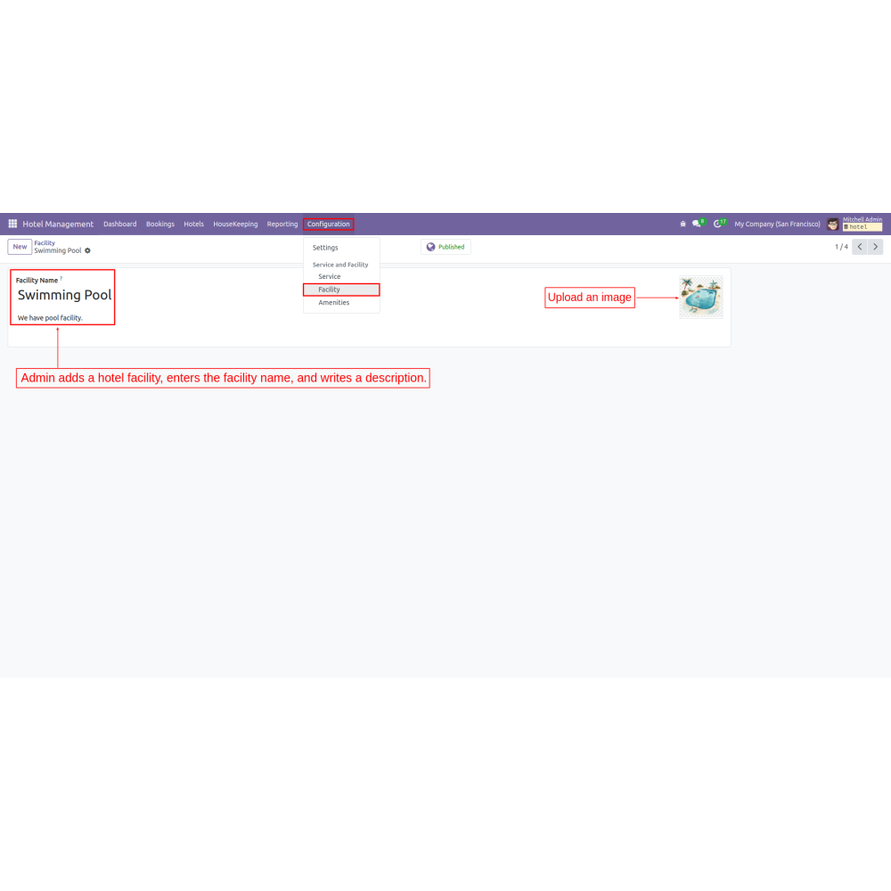 Navigate to Hotel Management -> Configuration -> Services, Facilities, Amenities.