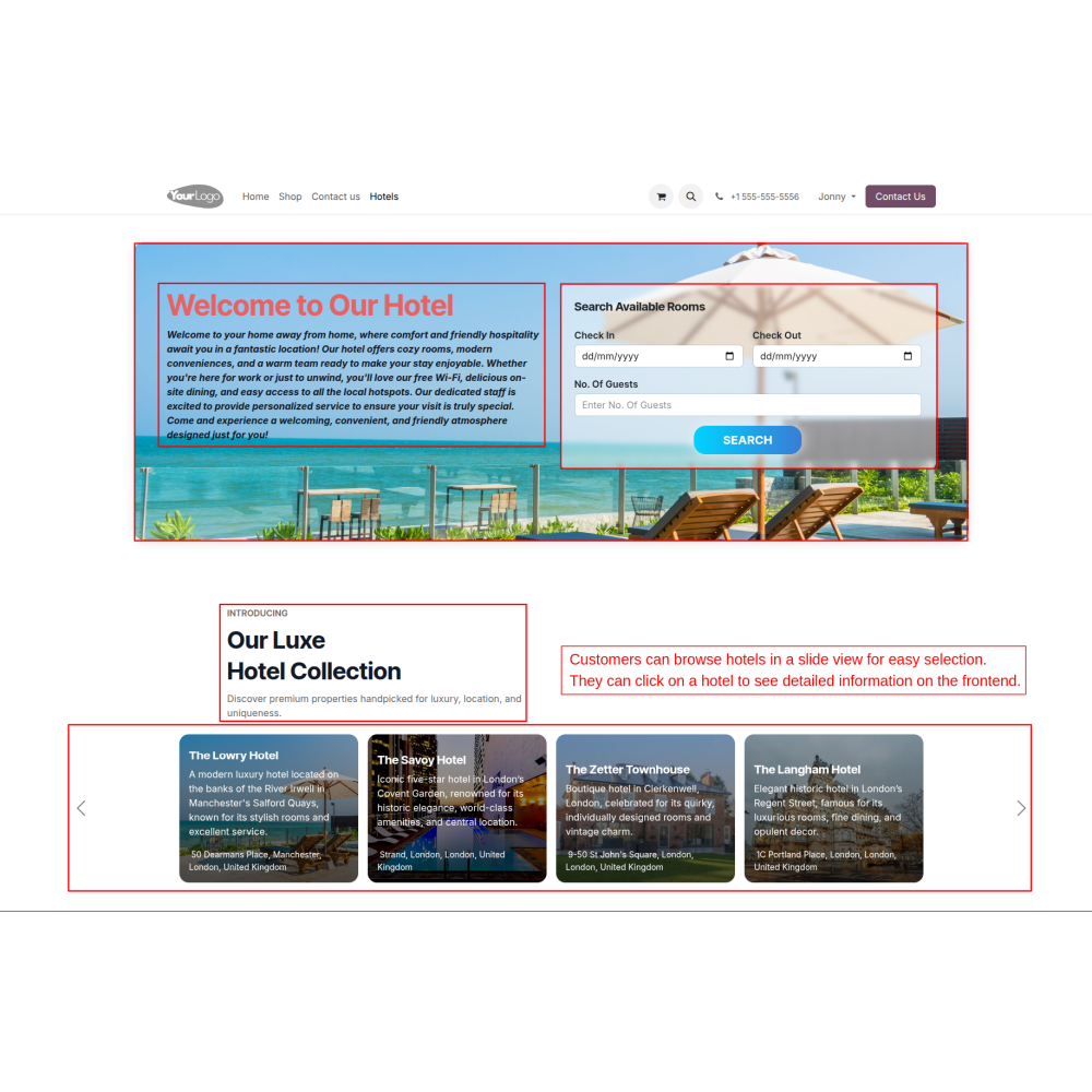 - On the frontend, customers can view available hotels, check room types, prices, extra images, services, facilities, and amenities.