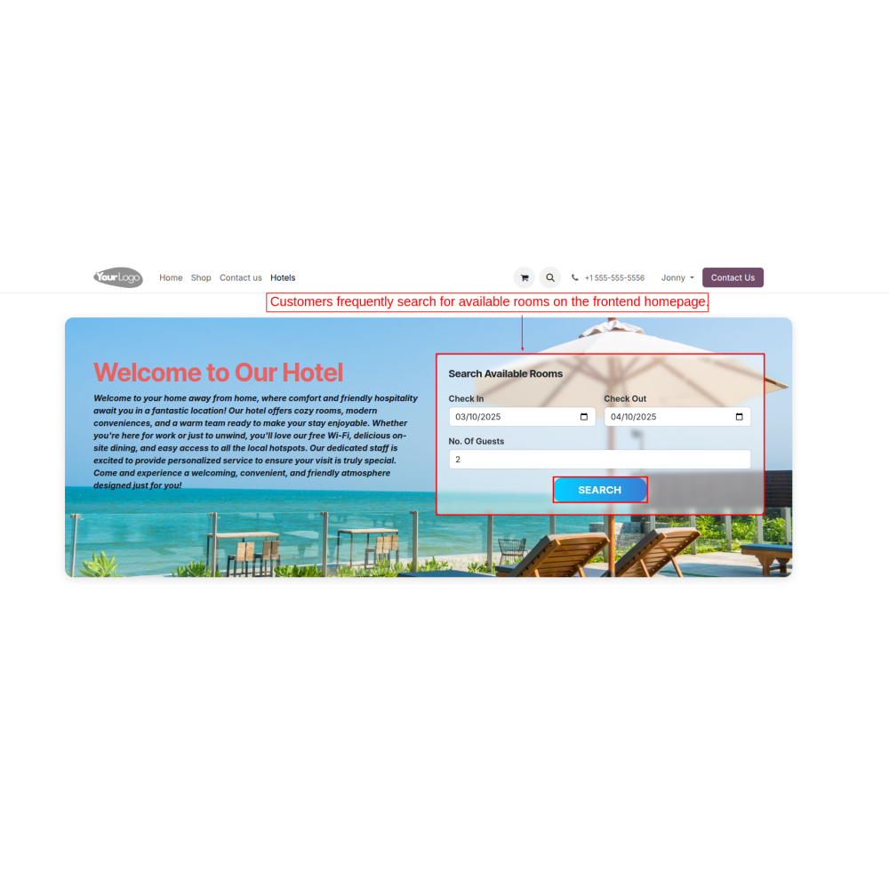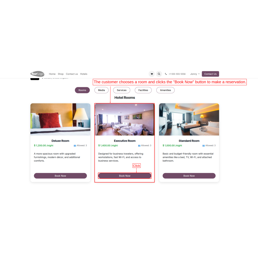 - When customers select a hotel, they pick a room, specify the number of adults and children, and select check-in and check-out dates.
