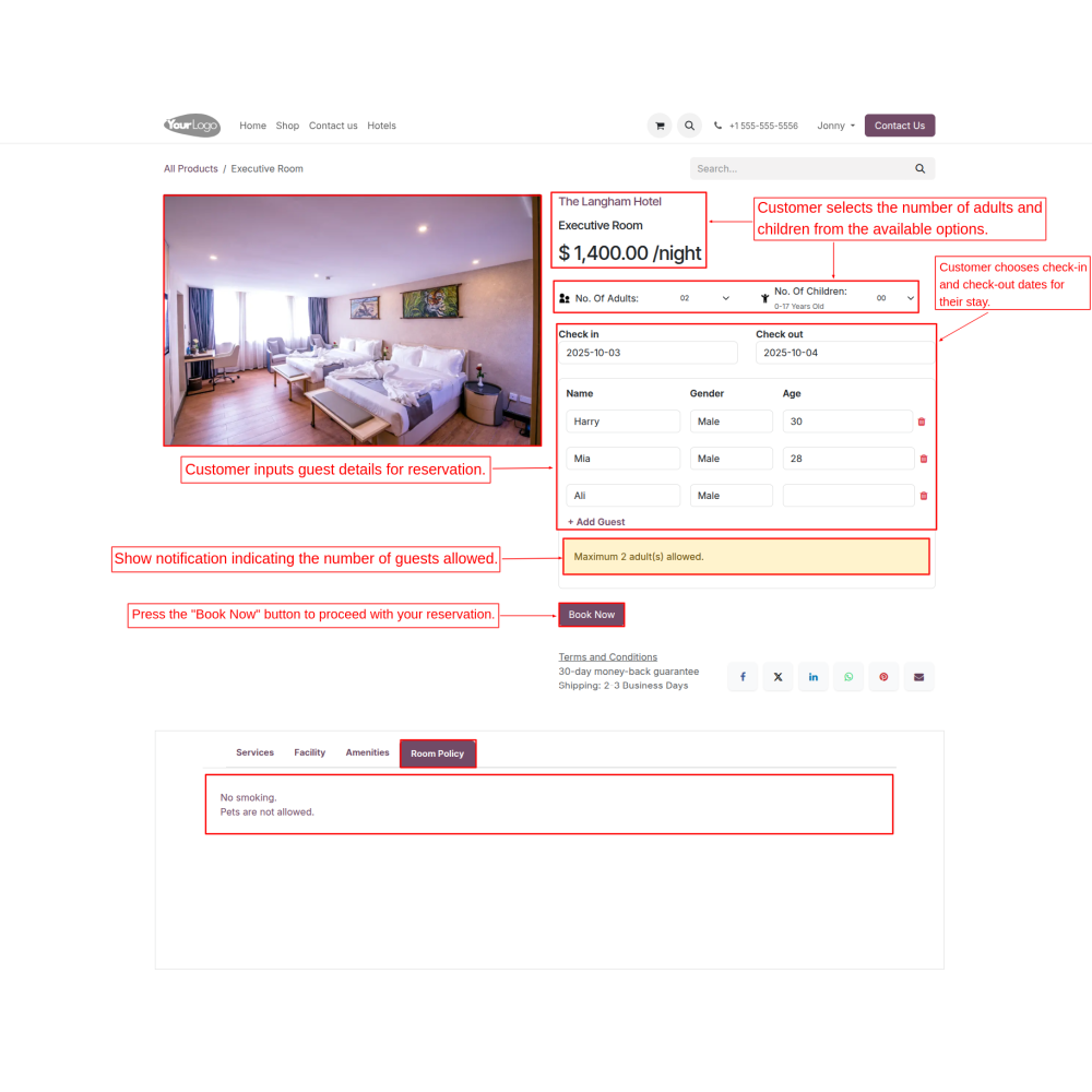 - When selecting a room, they specify the number of adults and children, and choose check-in and check-out dates, with the system automatically disabling unavailable dates.