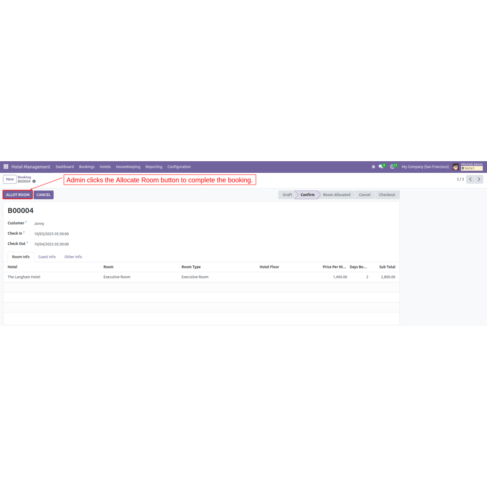 Once confirmed, the admin allots rooms and manages checkout under the Booking History section.