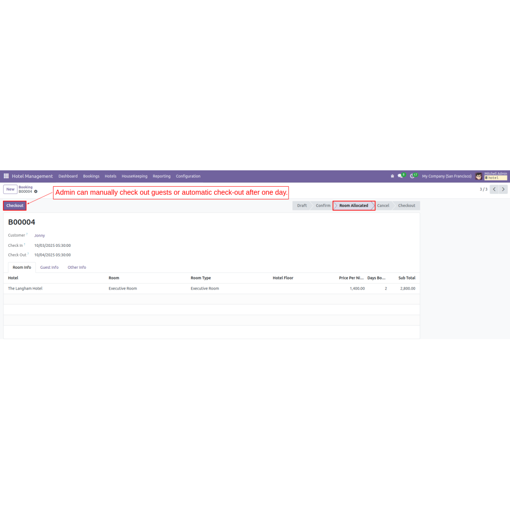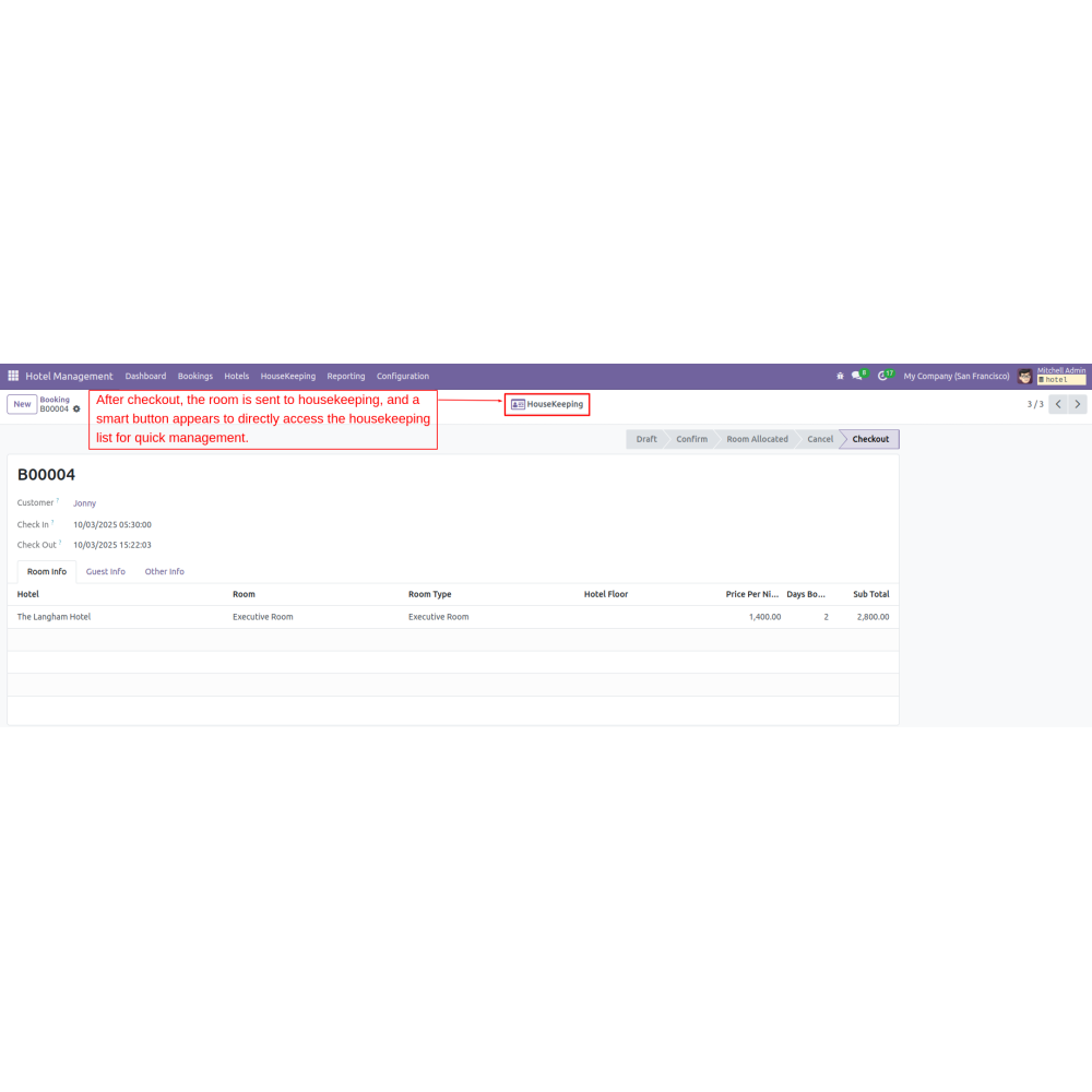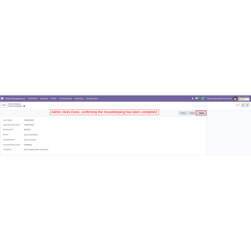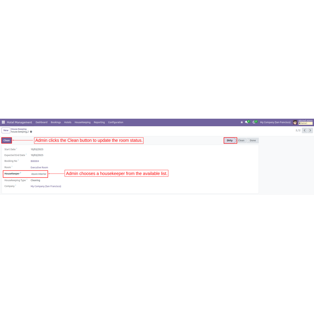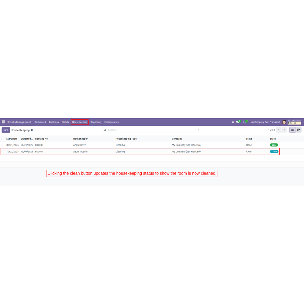 - After checkout, room statuses update automatically to "dirty," and staff can mark rooms as "clean" once the cleaning process is complete, providing an accurate representation of room availability.