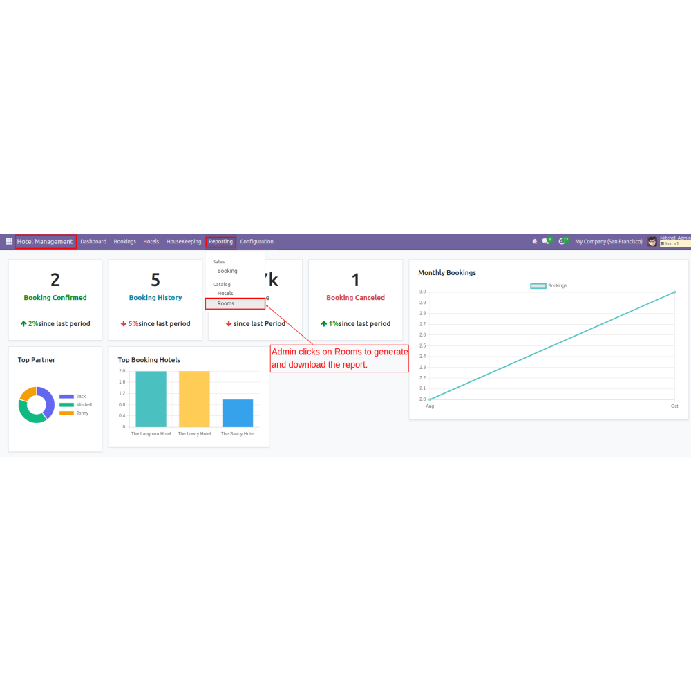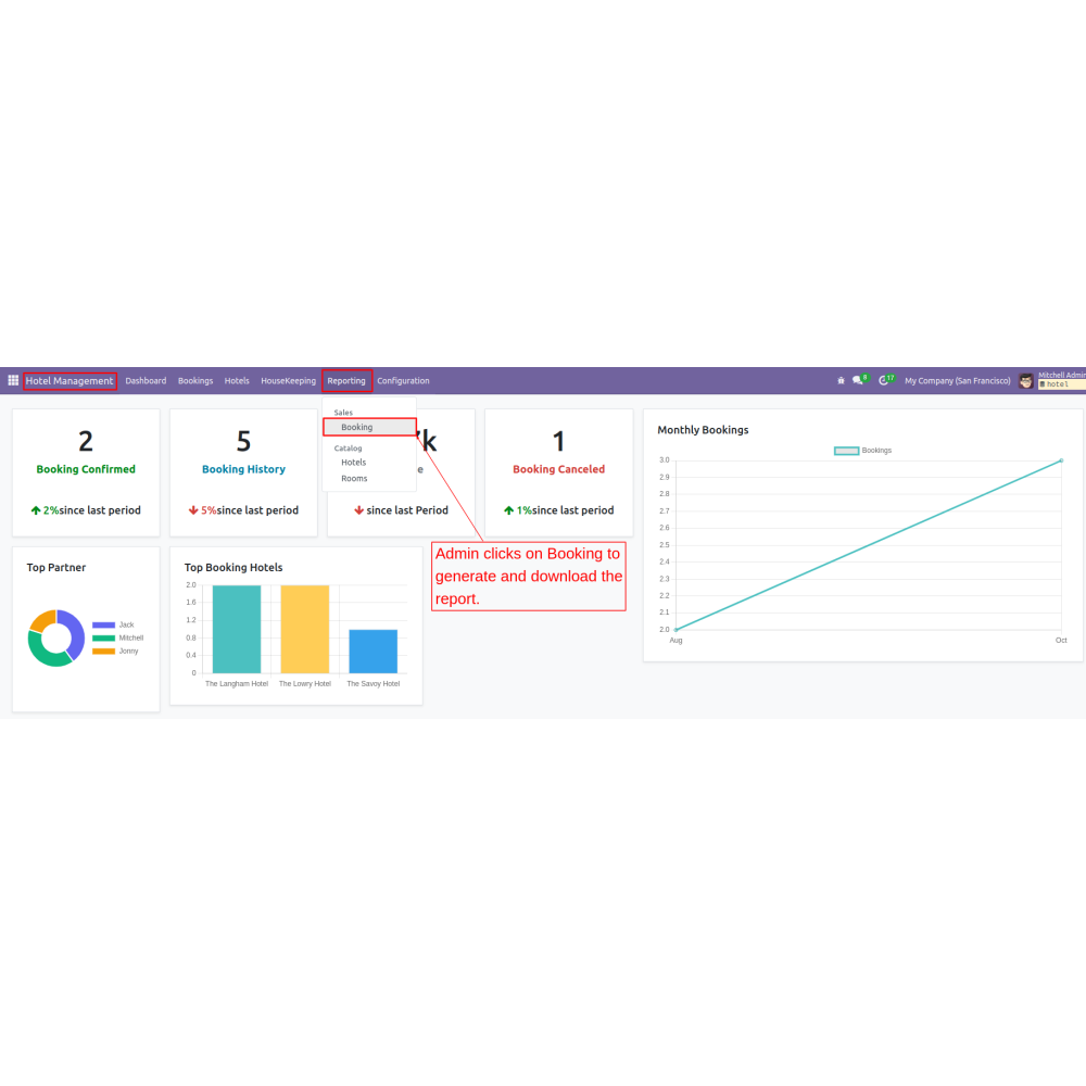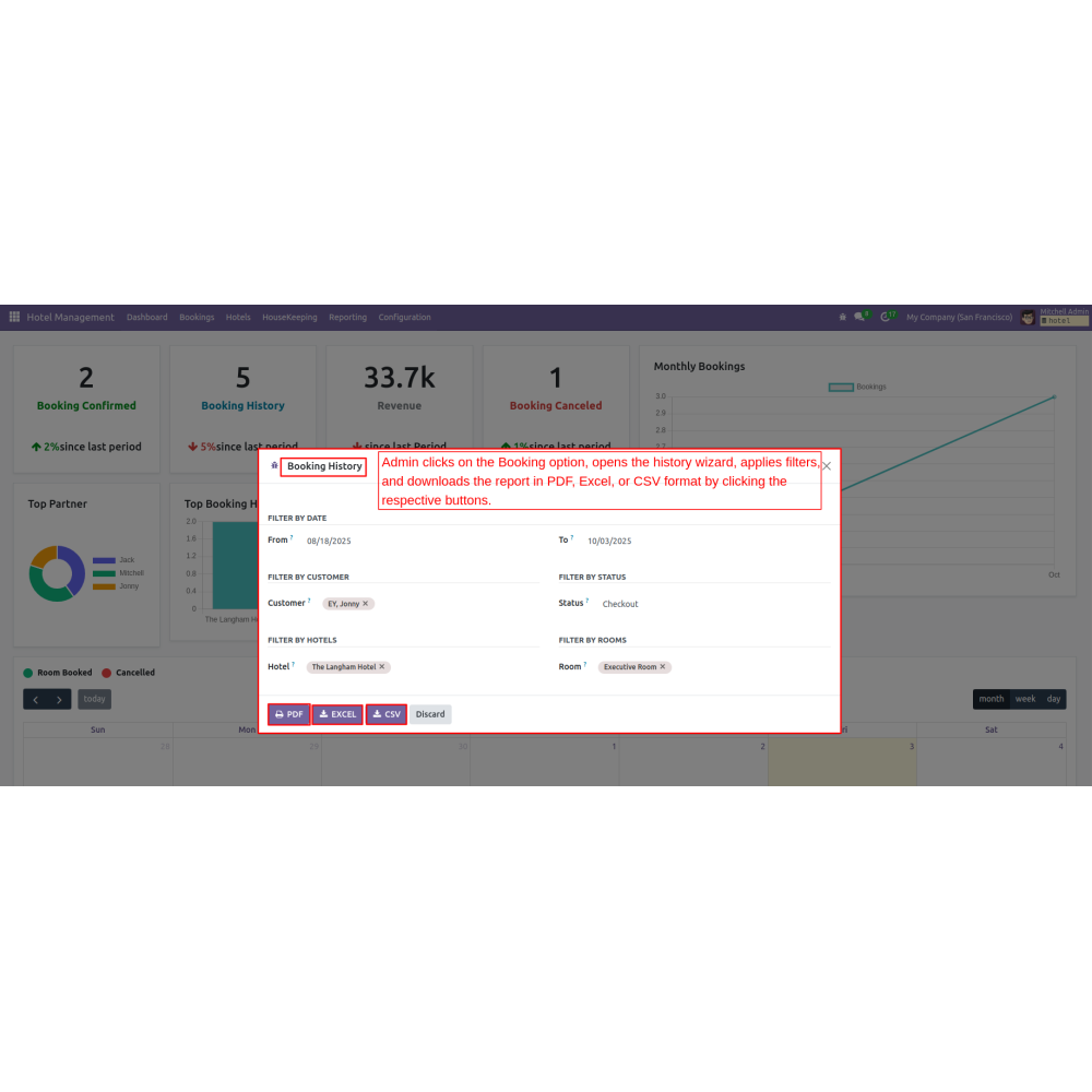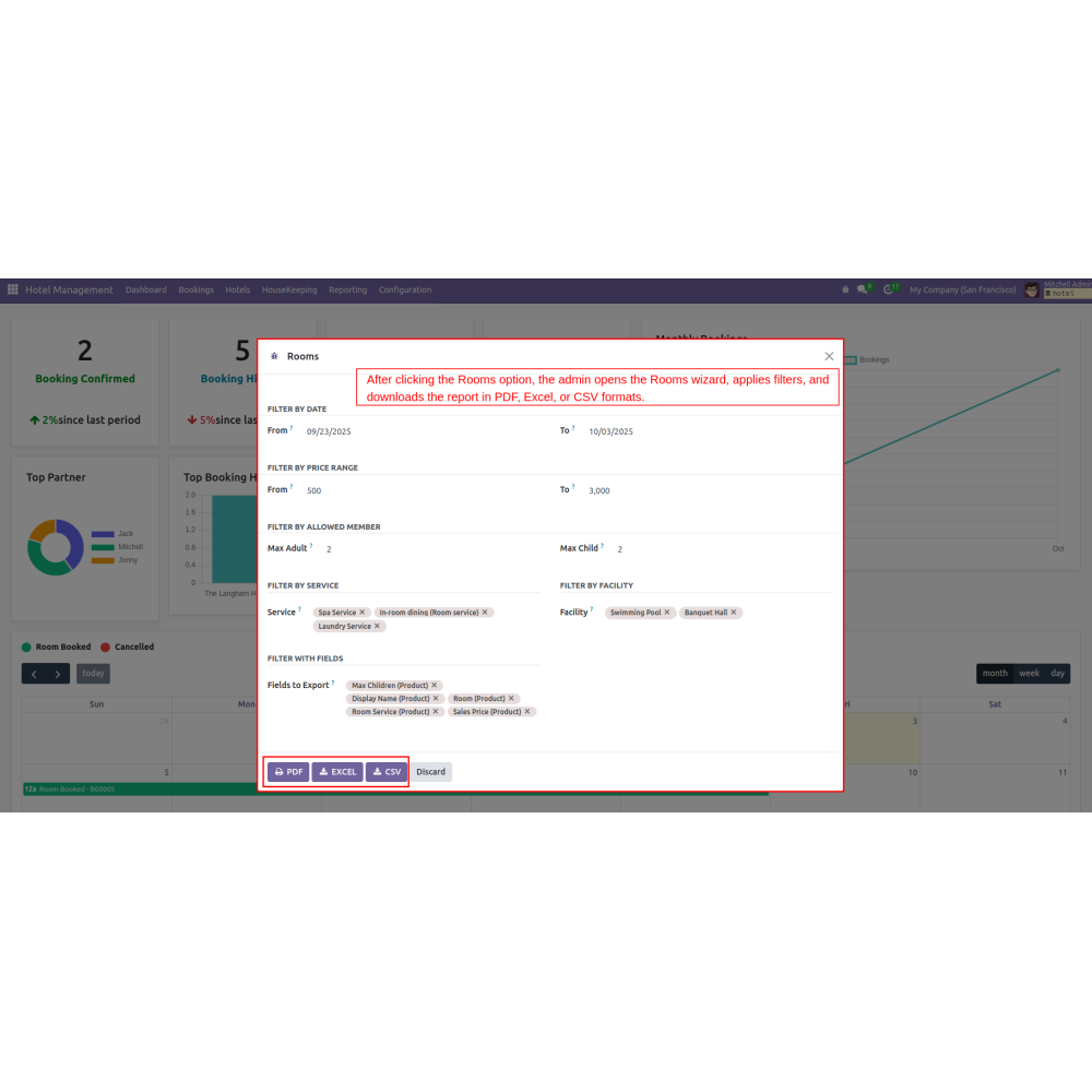- Admins have access to comprehensive reports on bookings, revenue, cancellations, and overall hotel performance. Hotel reports also allow filtering and exporting data in PDF, CSV, or Excel formats.