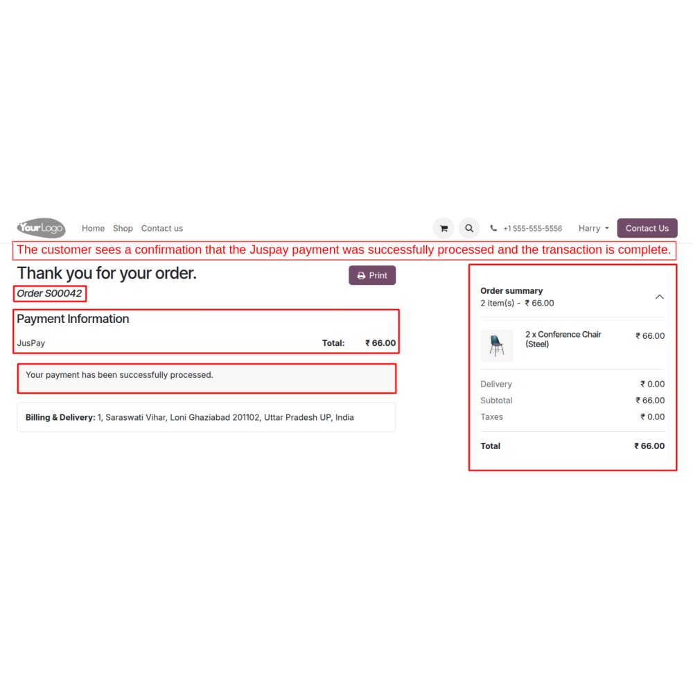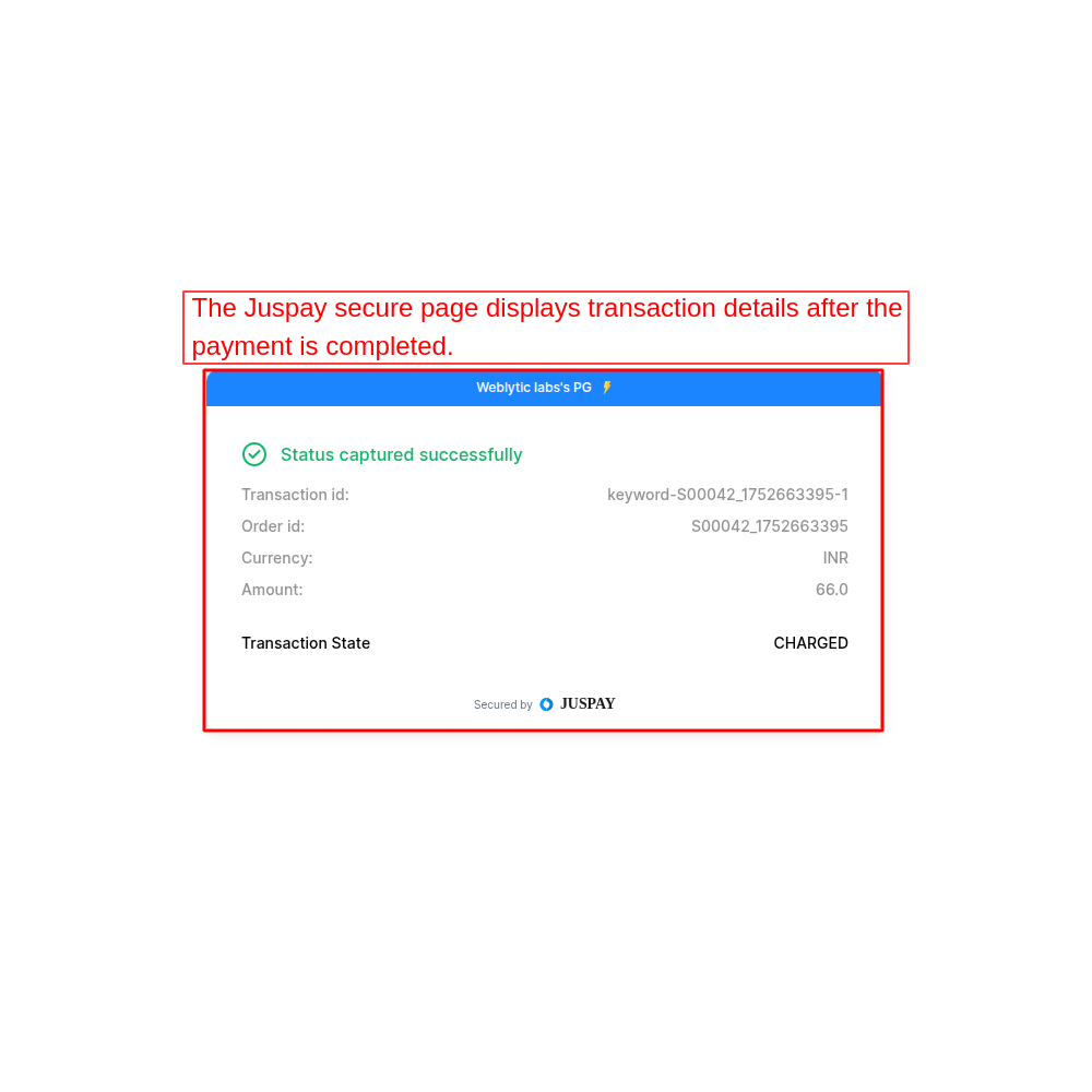 • Once complete, Juspay displays transaction details, and customers see a success message.