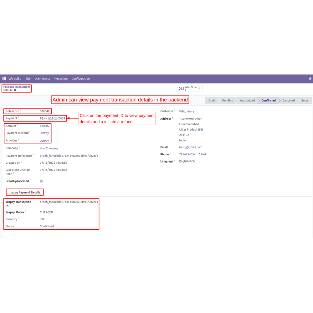 What is Juspay Payment Gateway with Refund?Juspay Payment Gateway with Refund allows online businesses to accept payments from customers worldwide, supporting over 50 countries and 29 currencies. Customers are redirected to Juspay’s secure page to enter their card details, and upon confirmation, the system displays a success message. Admins can view all payment and refund transactions in the backend, process refunds instantly, and track records easily. The merchant can also review transaction details on the Juspay sandbox dashboard, making online payment management safe and efficient.