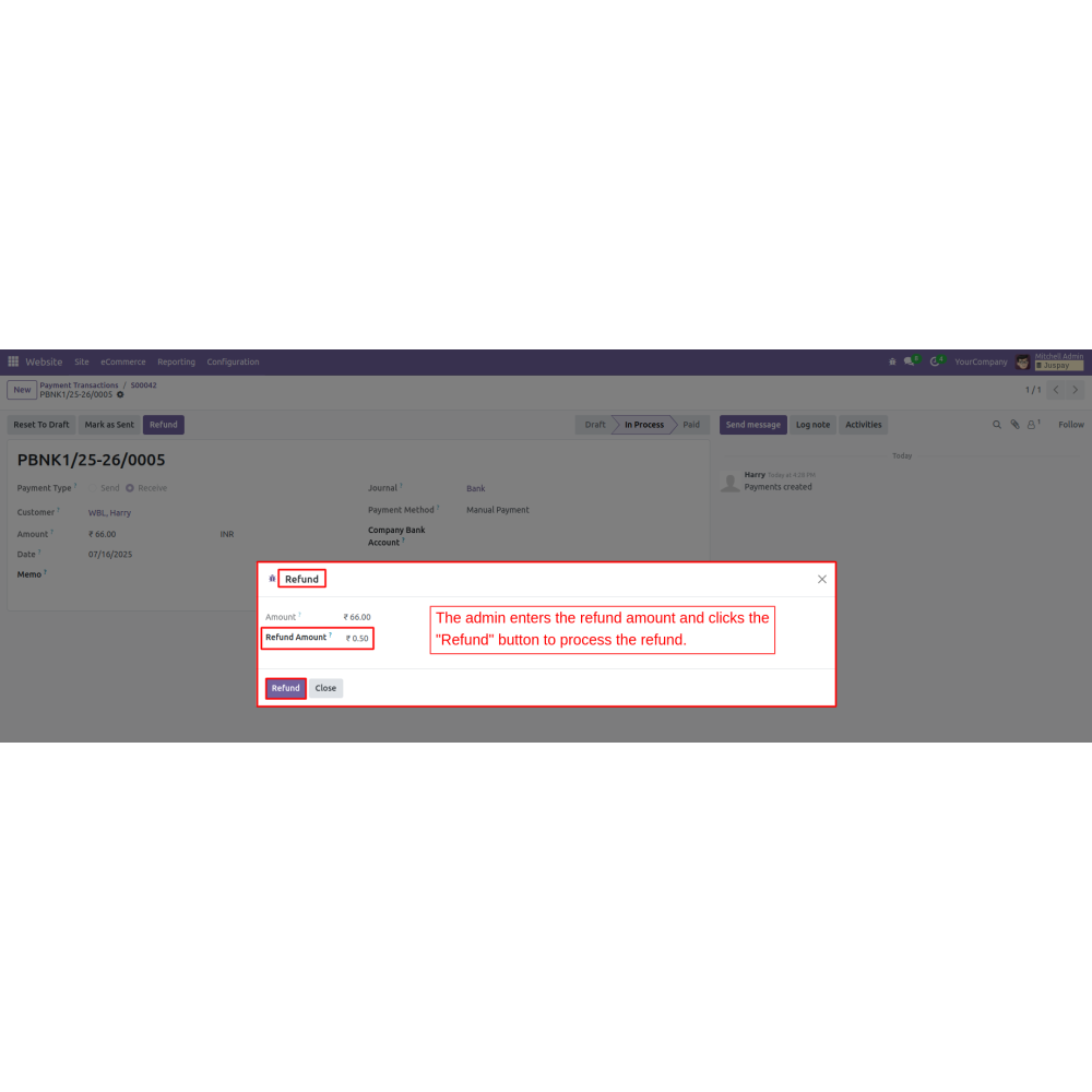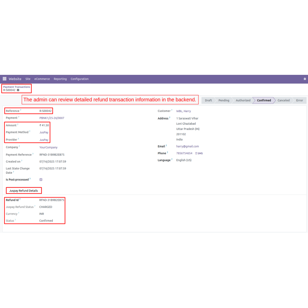 • On the payment detail page, the admin clicks the Refund button. Open the Juspay refund wizard: Enter the refund amount according to preference. Admin clicks Refund. The refund transaction is processed through Juspay.