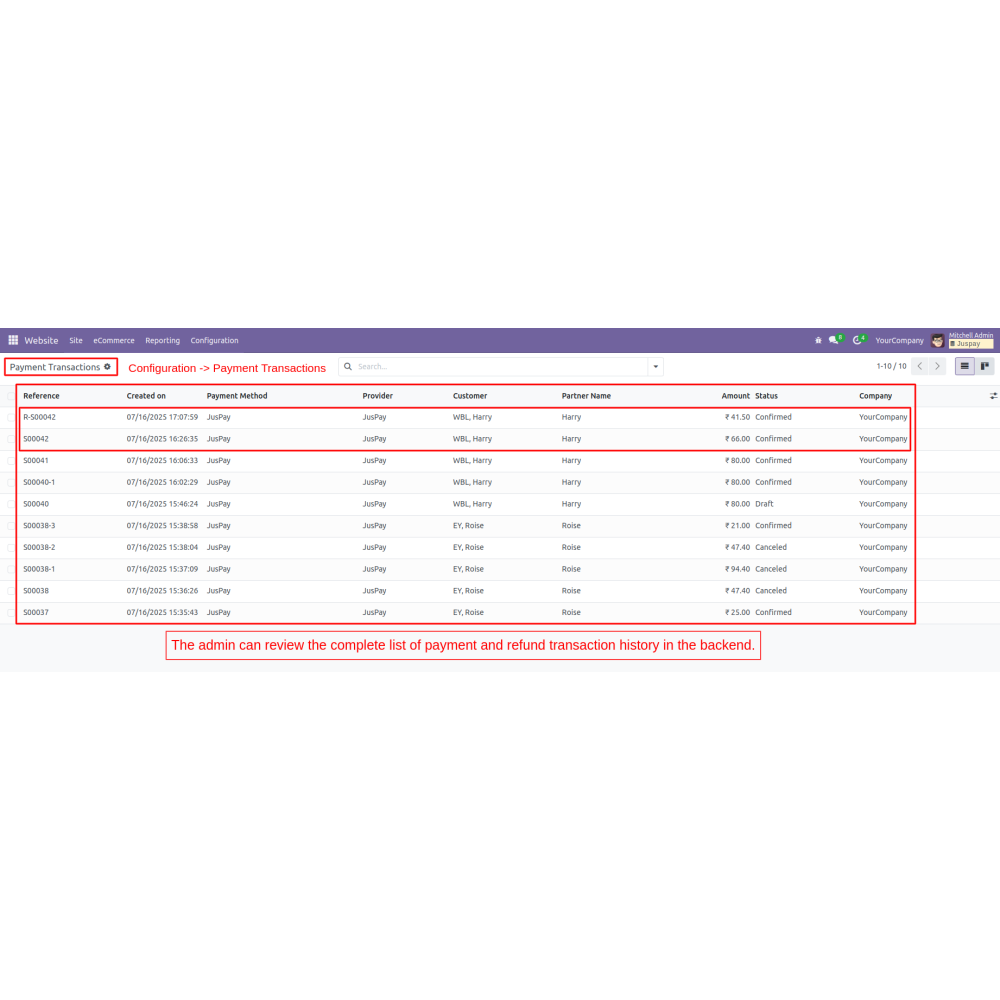 • Admin navigates to Website > Configuration > Payment Transactions to view the complete transaction history.