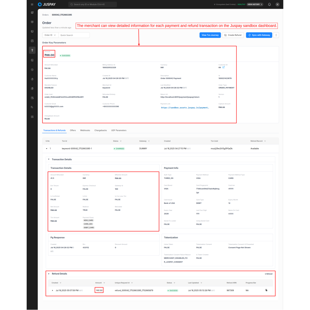• The merchant views all payment and refund transaction details on the Juspay sandbox dashboard.