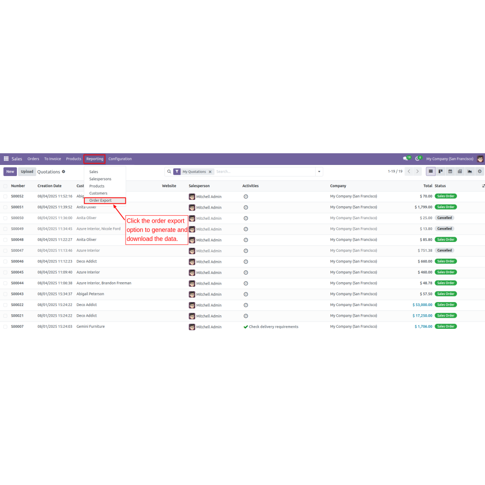 Can I filter data before exporting?Yes, you can filter reports by customer, salesperson, website, order status, date range, and order amount for targeted exports.