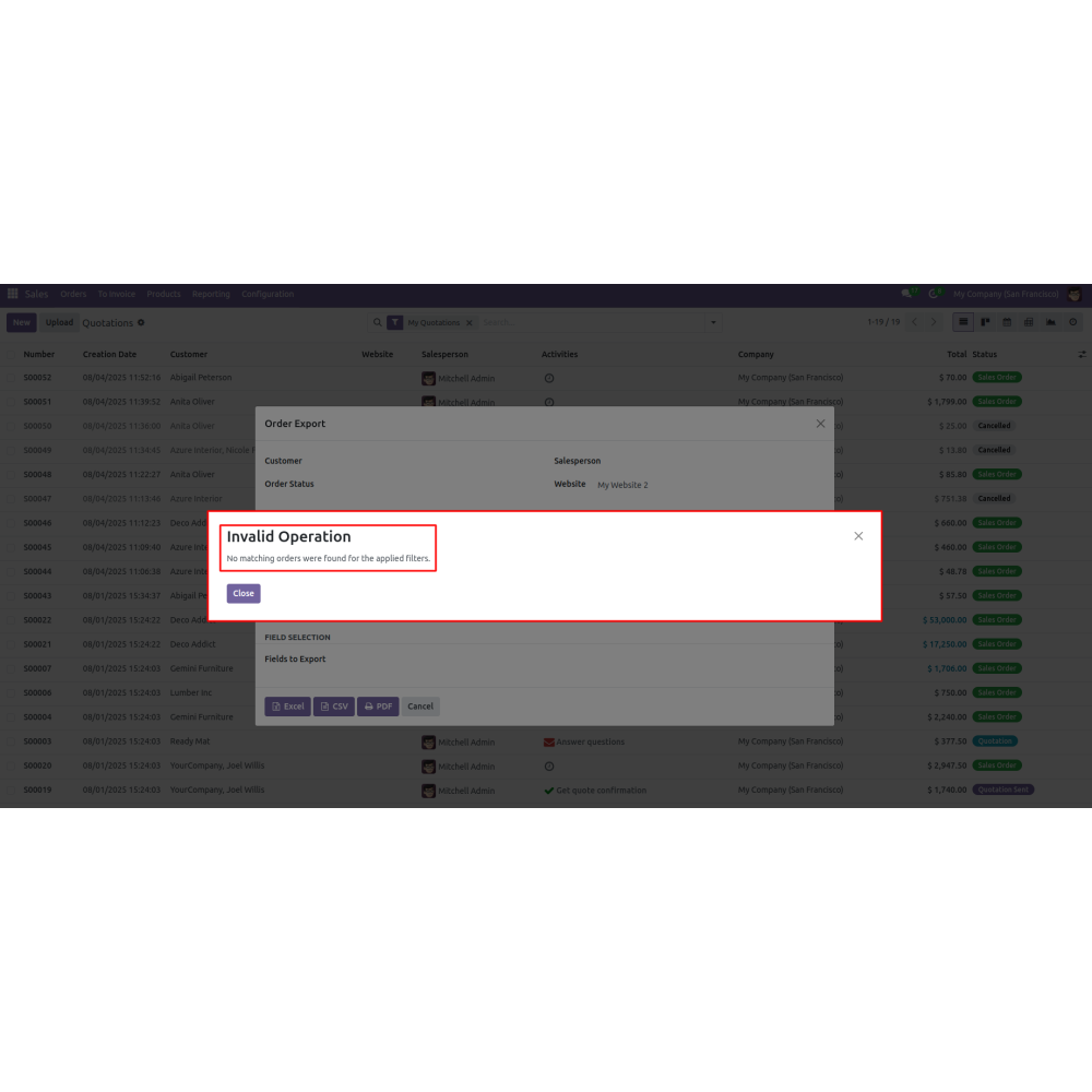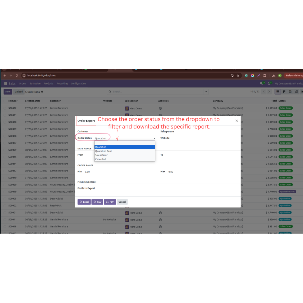 What is Order Export Pro (CSV, PDF, Excel)?Order Export Pro simplifies the process for admins to generate detailed order reports across sales, POS, and inventory modules. Using an intuitive wizard, admins can apply filters such as customer, salesperson, website, order status, date, and amount, then export reports in CSV, PDF, or Excel formats. These files can be downloaded instantly for analysis, record-keeping, or sharing, streamlining workflows and ensuring organized, accurate reporting for better business insights.