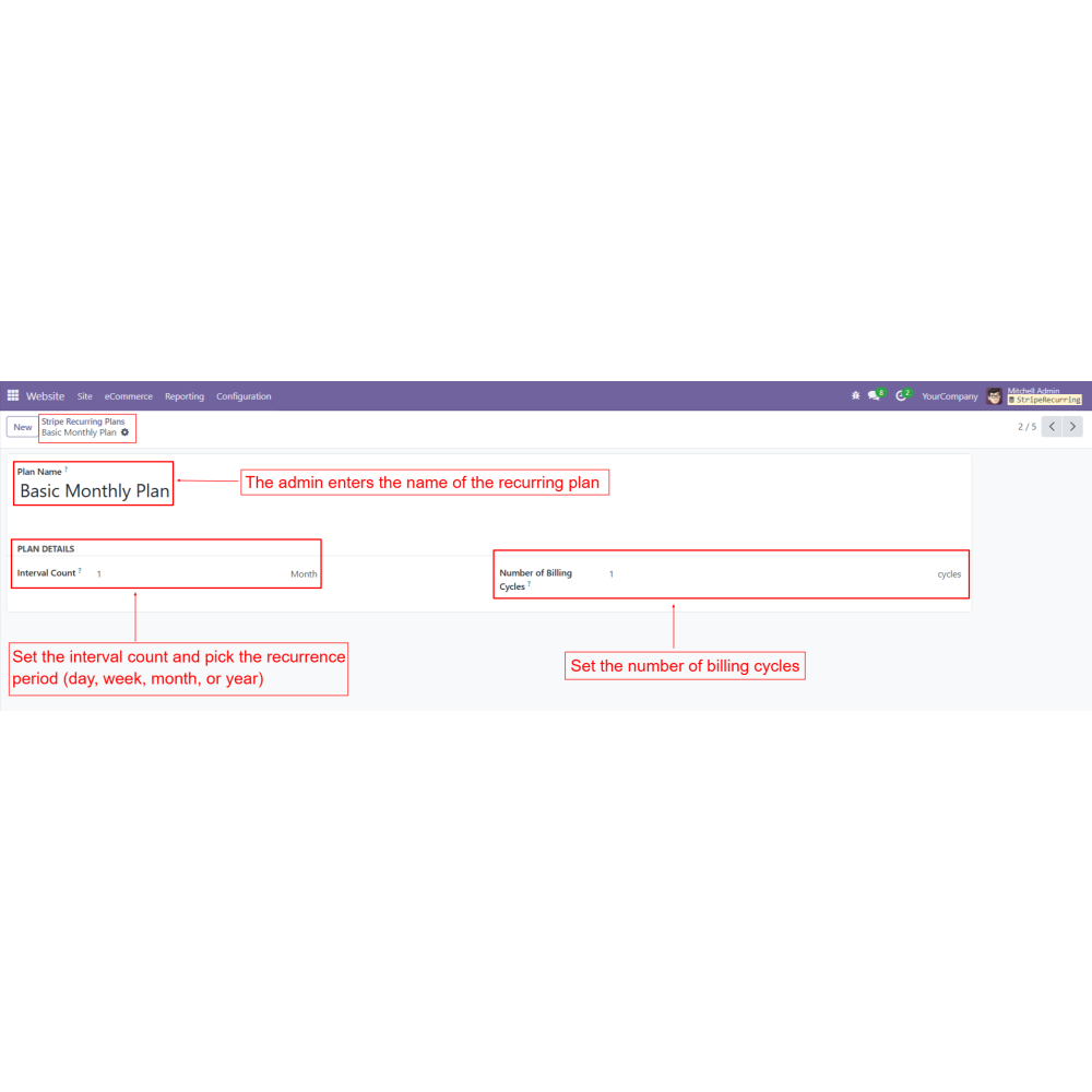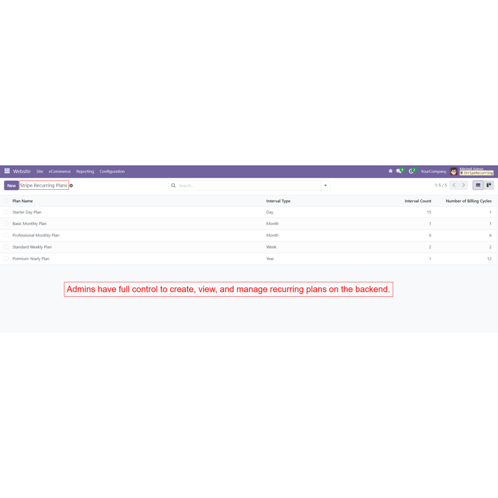 - From the backend, the admin creates and manages recurring plans by defining interval counts and billing periods.