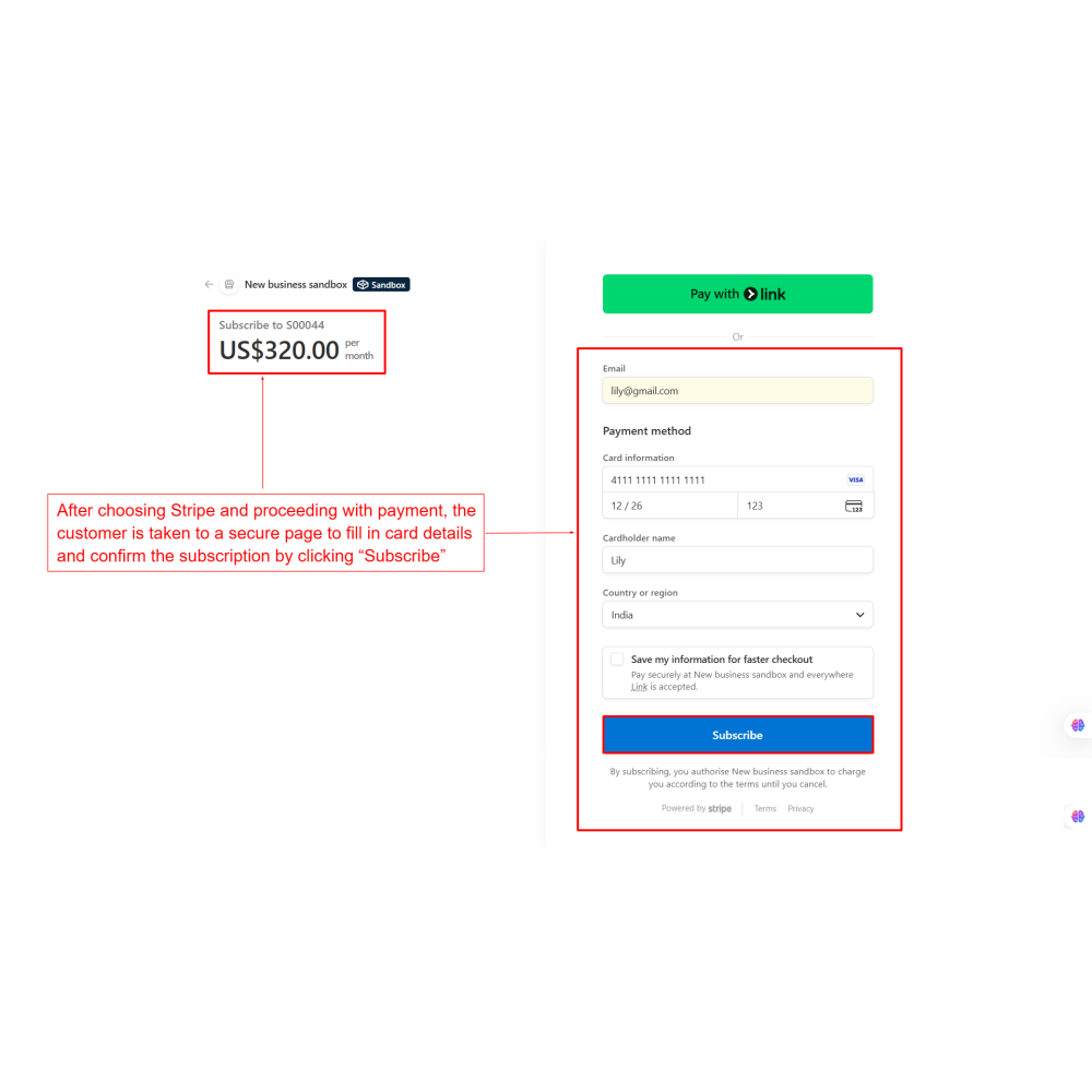 - Customers can subscribe using the Stripe payment method during checkout, enter their card details on a secure Stripe page, and activate auto payments.