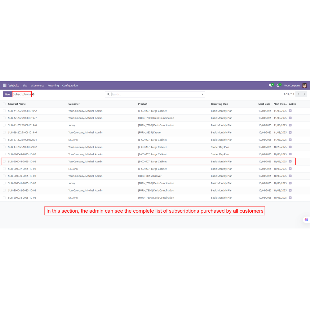 Admin can track all subscriptions (active, expired, or cancelled) in the Odoo backend under Website → Configuration → Subscription.