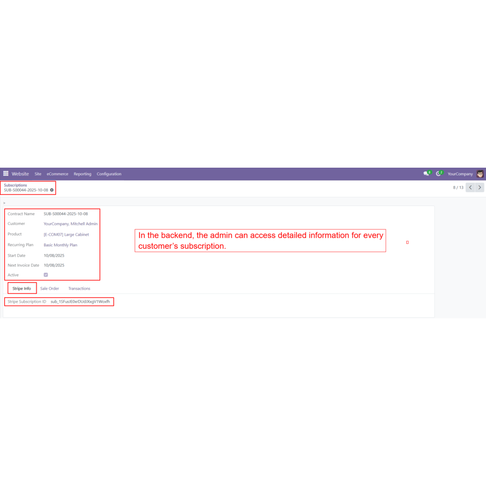 - Admins can manage all subscriptions from Odoo’s backend and the Stripe dashboard.