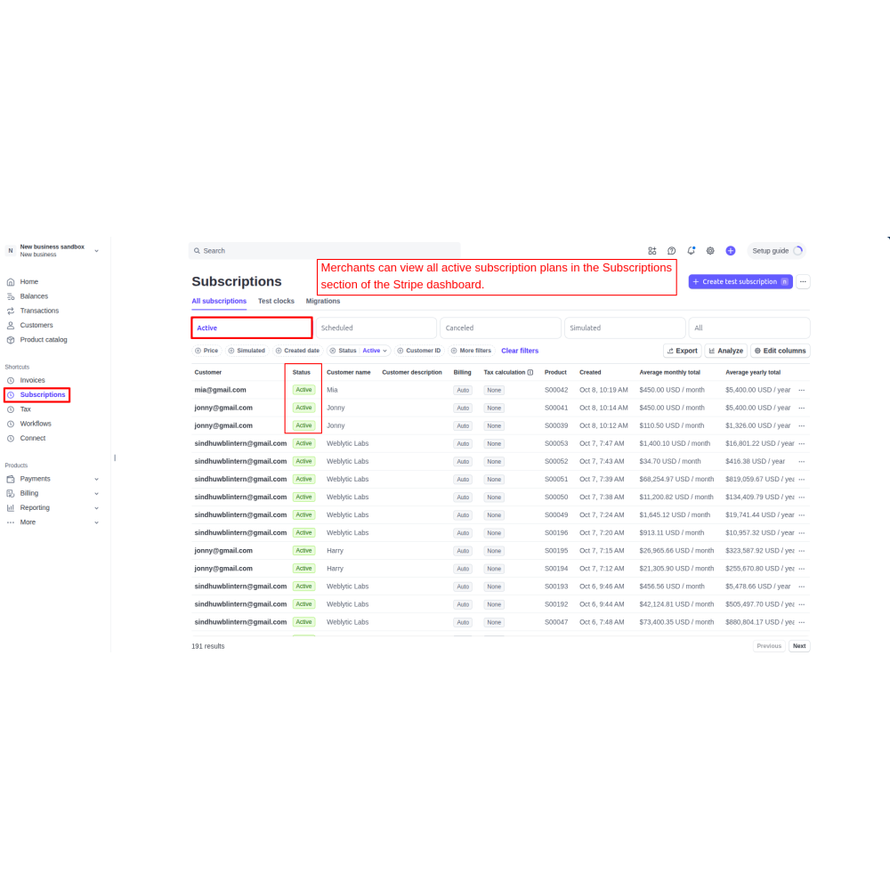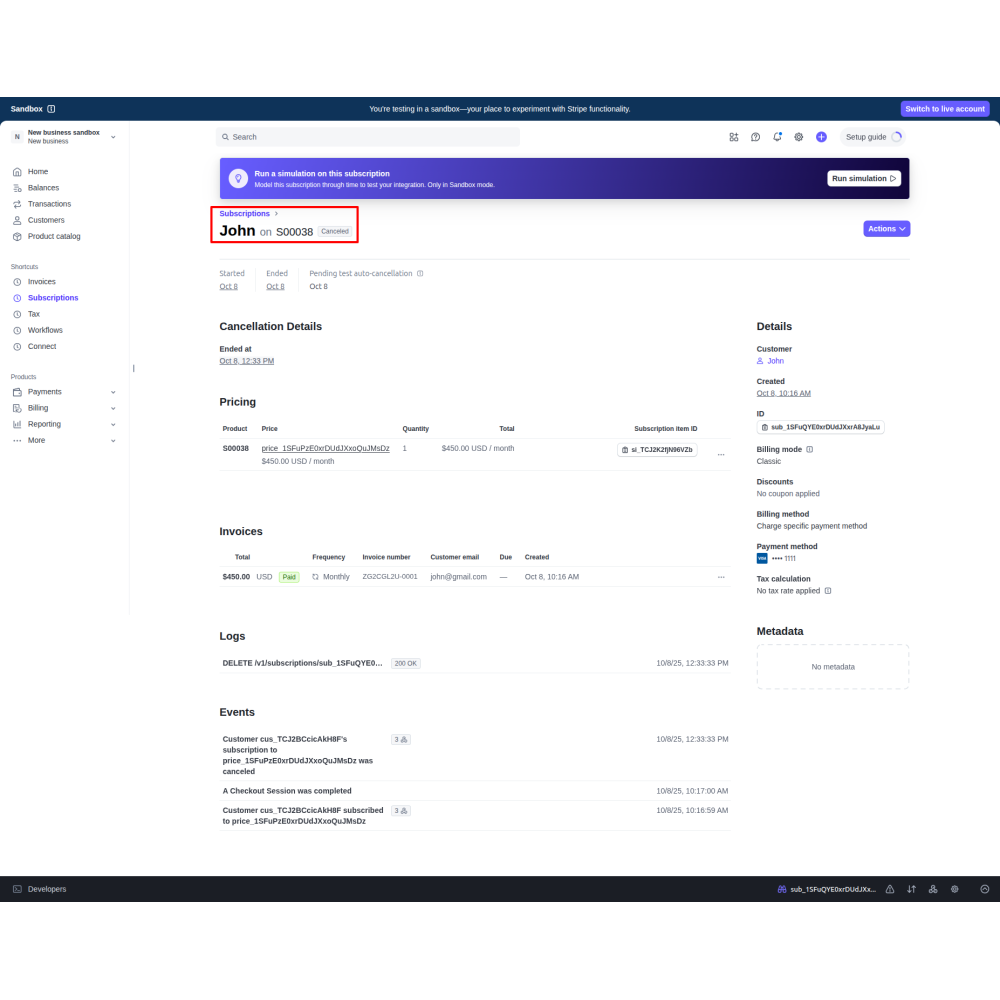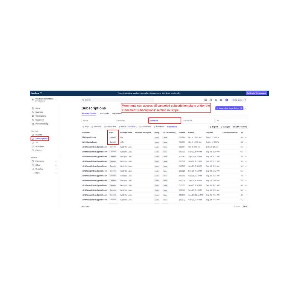 Subscription statuses are automatically reflected in the Stripe Dashboard.