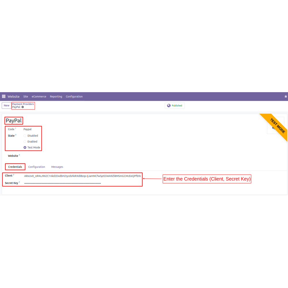 - Admin selects PayPal as the payment provider, enters the client ID and secret key, and publishes it.