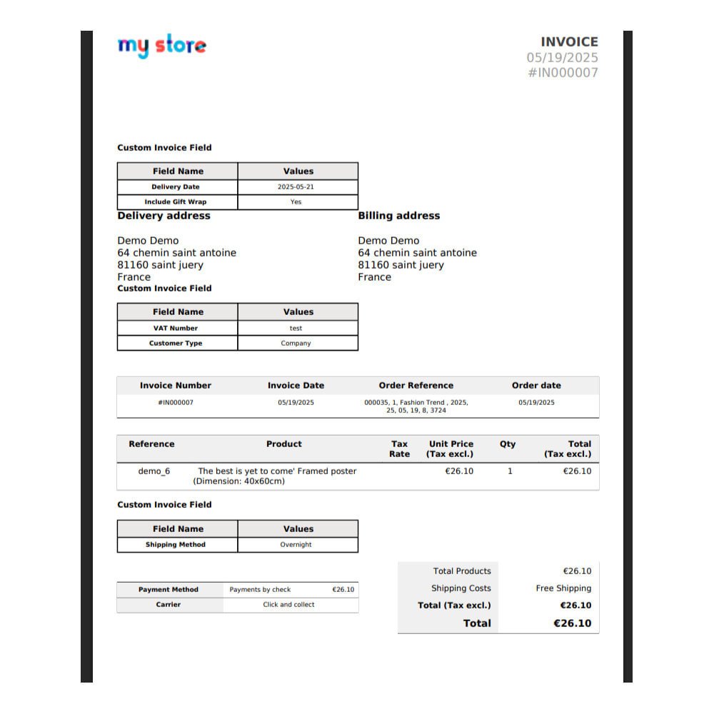 Add custom fields to PrestaShop invoices for B2B, compliance, or extra details. Customize type, visibility, placement, and apply rules based on customers, groups, or products.