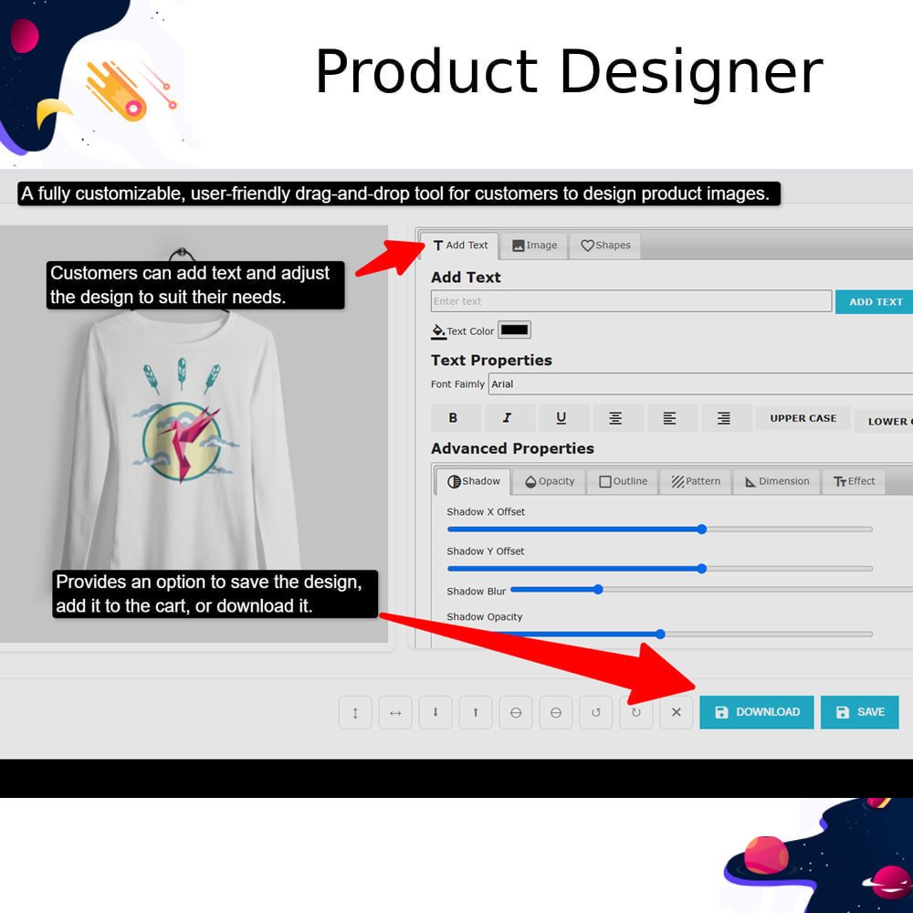 Allow customers to personalize products with live image preview, text and clipart tools, mobile-friendly design area control, and print-ready output.