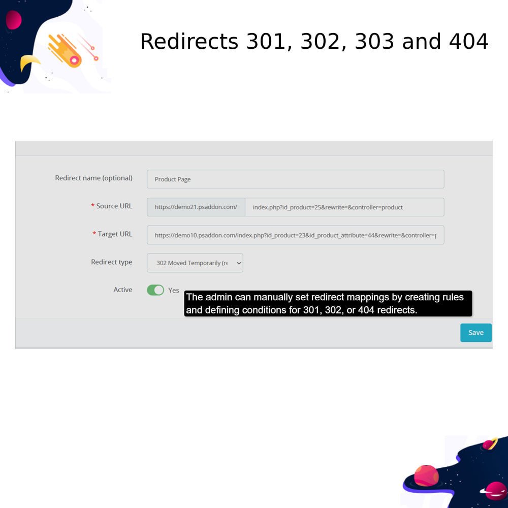 What does this module do?It allows you to manage SEO-friendly redirects (301, 302, 303) and fix 404 errors in PrestaShop to maintain traffic and improve search engine rankings.