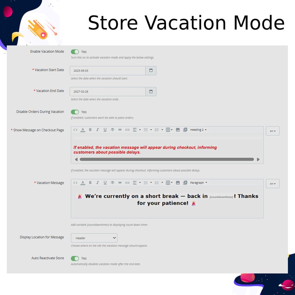 This module lets store owners pause orders and notify customers during holidays, displaying customizable messages and blocking checkout if needed.