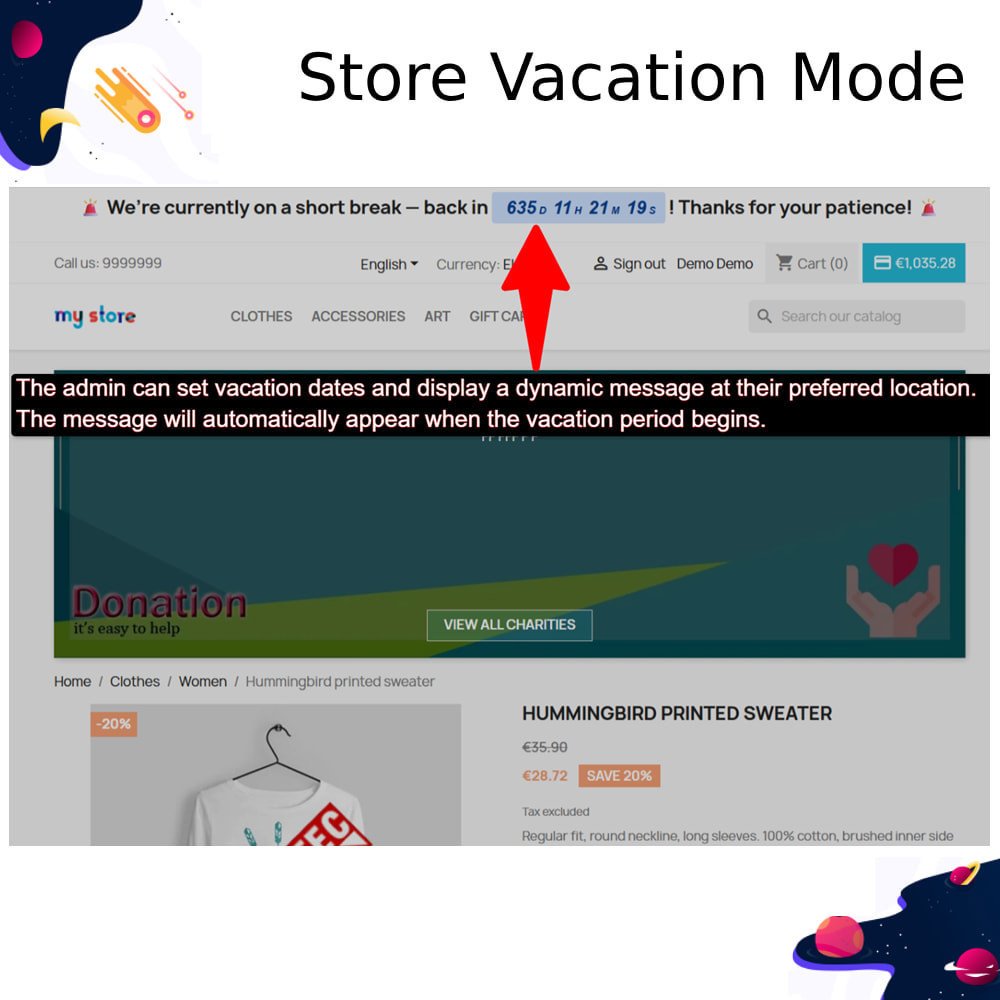 Display a visual banner alert on the storefront with your custom vacation message and expected return date to keep customers informed and reduce inquiries.