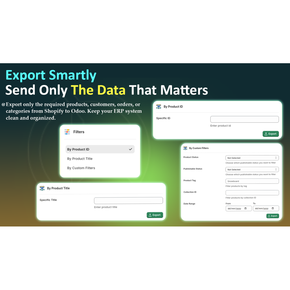 Seamlessly sync products, orders, customers, and categories between Shopify and Odoo. Automate data transfer, track activity logs, and manage imports and exports with filters for precise control.
