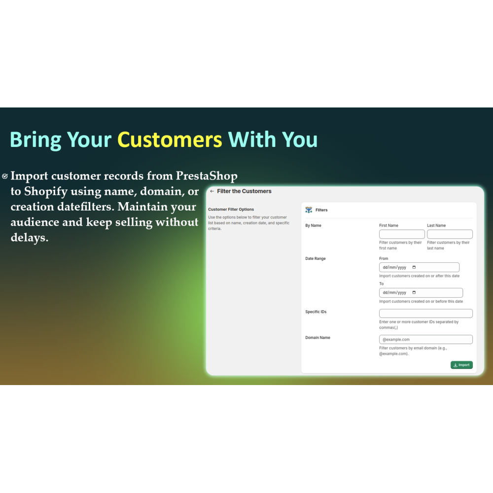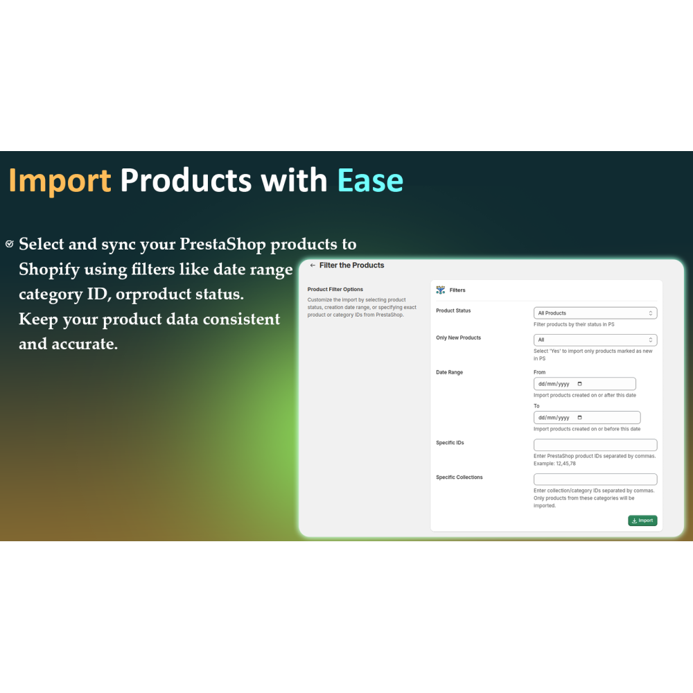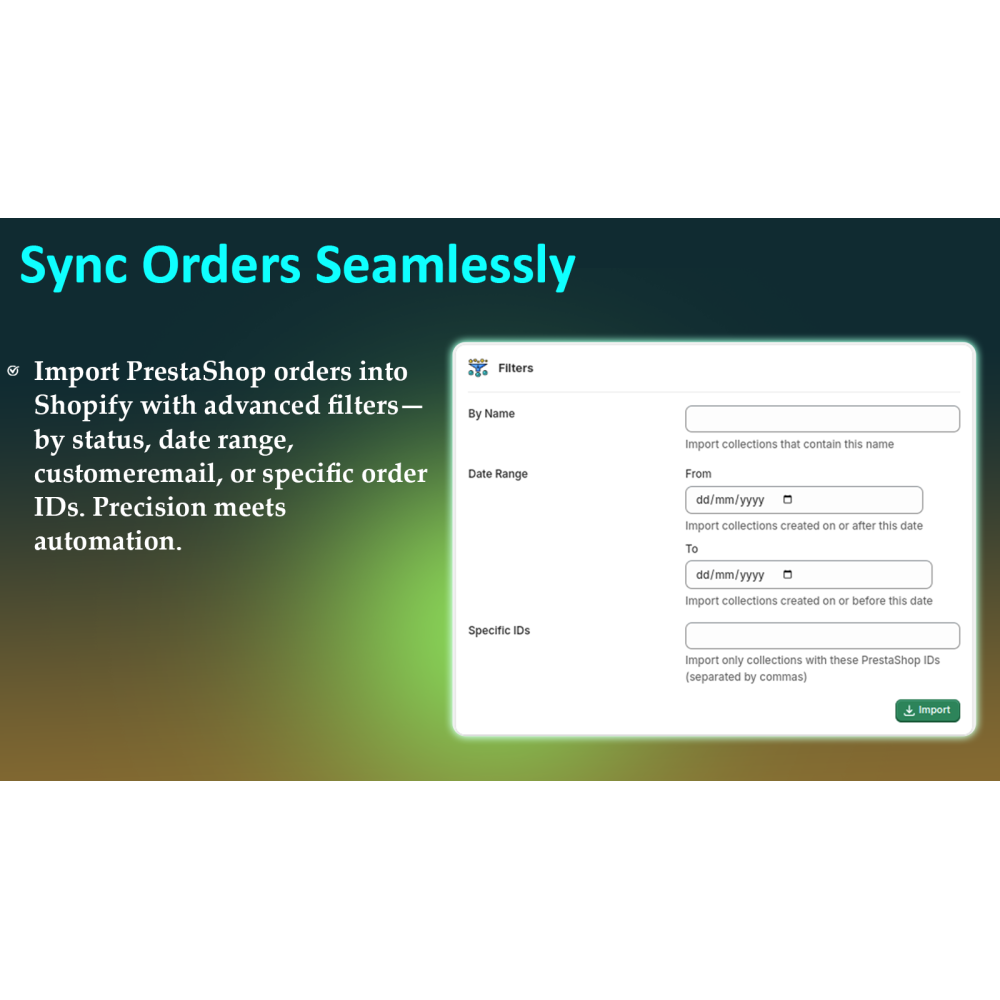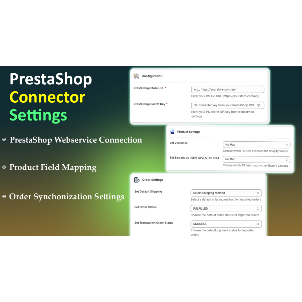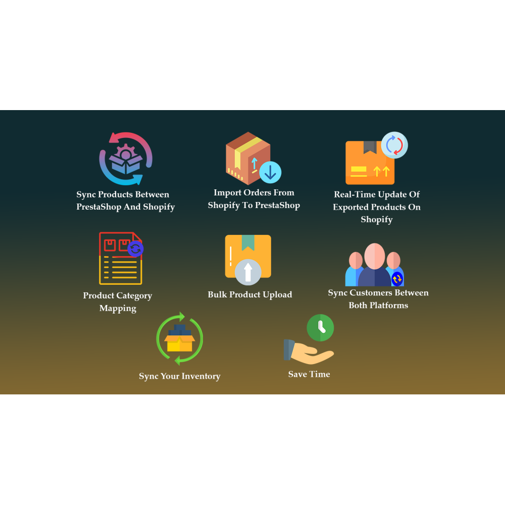 Seamlessly import/export and sync products, categories, orders and collections from PrestaShop to Shopify. Automate data mapping, avoid duplicates, and keep your store updated.